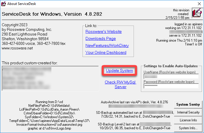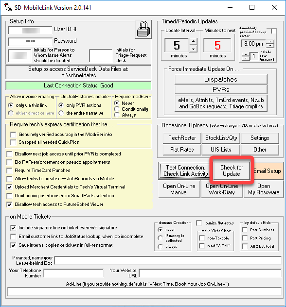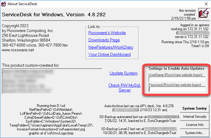 In ServiceDesk, verify that your UserName and Password are in the About ServiceDesk form (CTRL + SHIFT + A) as needed for any updating methods listed below.