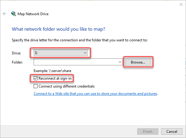 \\YOURSERVERNAME\sd(replace YOURSERVERNAME with your actual server name, found using the tip above)Ensure the box labeled “Reconnect at login” is checked.