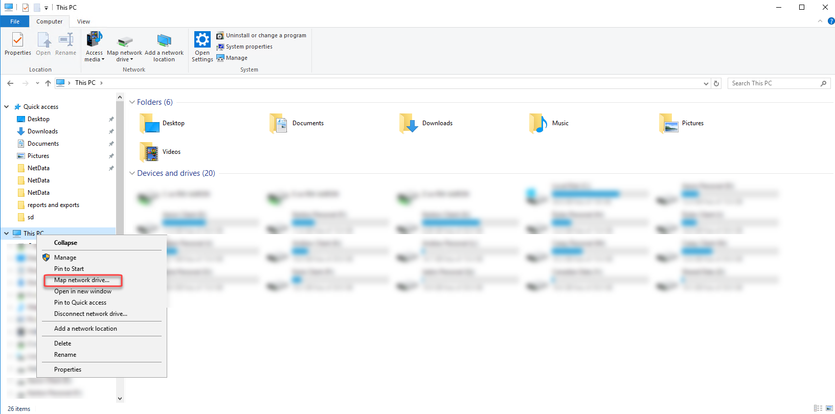 When the drive is mapped, open it up (you can press Windows + E on your keyboard and click the mapped drive letter you created in the steps above).