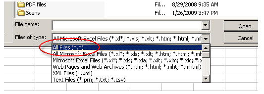 In particular, after opening Excel choose its File-Open dialog. In the ‘Files of Type’ drop-down at the very bottom, you’ll need to choose ‘All Files’, as per the following: