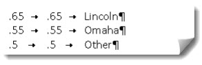 If this is your situation, you’ll want to use essentially the same file setup as above described, only now the file’s contents will be slightly more complex. Specifically, it will contain multiple line-item rate specifications, one line for each different sales location, and now instead of just the two fields (each separated by a tab), there will be three. That third field will be a text string that, in each instance except (potentially) the last, will match a name of one of your Departments. Thus (and with normally-hidden tabs and return characters made visible here for your benefit), the text in your file might look something like this: