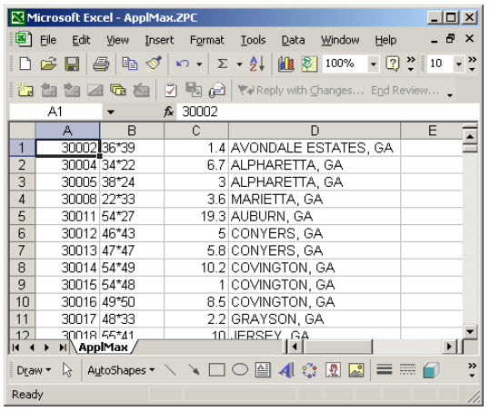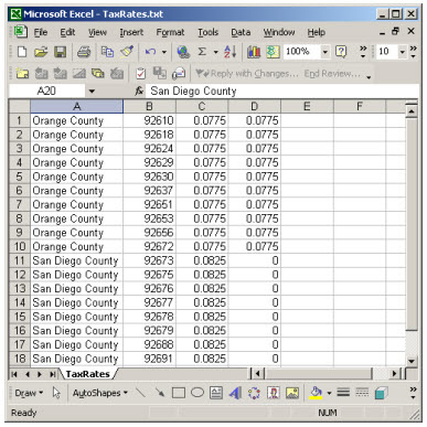 As you can see, we have rows and columns precisely fitting the description provided at the outset of this chapter. The first column describes each applicable jurisdiction, second the zip code, third the applicable tax rate for materials, and fourth the rate as applicable to labor.