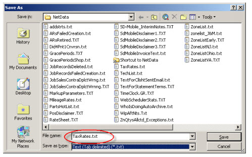 Specifically, the type must be a tab-delimited file. The name must be TaxRates.TXT. The location must be the \sd\netdata folder on your server drive. All these are essential. If you miss on either of the latter two, ServiceDesk will not find your file. If you miss on the first, it will fail to properly read its data.