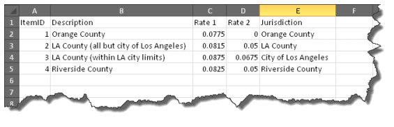 Your tax-rates document will consist of rows and columns. There will be a “row” (aka line of text) for each zip code in your area, with each such line divided into four data elements (sometimes called “fields”) as follows: