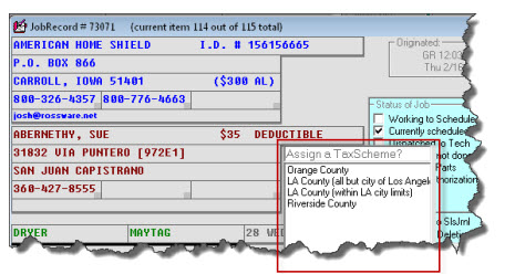 When you do a Job/Sale transition from a Callsheet to JobRecord, ServiceDesk looks to see if the applicable zip or postal code is included (in particular, as a single line-item entry) in your TaxRates file. If yes, it then looks for text in that line-item's 6th column. If it finds a number there, it figures: "Aha, that is the ItemID for the TaxScheme that should be assigned to this job." On that basis, it automatically assigns that TaxScheme to that job, and there is no need for a user to do it manually.