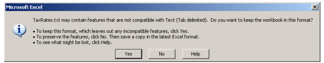 At this point, actually, you should be done — except Excel is going to pester you, and with messages that are quite confusing. Essentially, Excel knows if you save in simple Tab-delimited text format, you’ll lose any special formatting and related features that exist only in an Excel-format document. It wants to be sure you don’t do that unwittingly. In our case, in fact, that’s precisely what we want (i.e., text only, with no special Excel formatting), so when confronted with the following message: