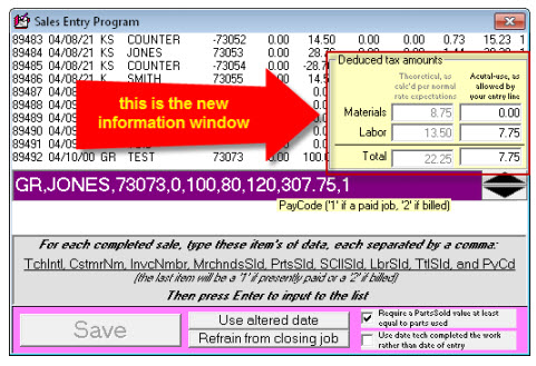 Even so, we have deemed it important, where such separation is occurring, to make it at least visible to the interested user, to allow verification as to whether the about-to-be-recorded separation is precisely as per intent. Thus, we have provided an added little window as involved when a user is making a (F9 form) SalesJournal entry. It will display the moment all fields are inserted within the entry line: