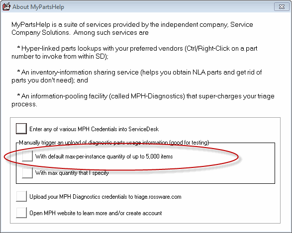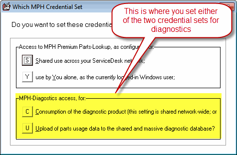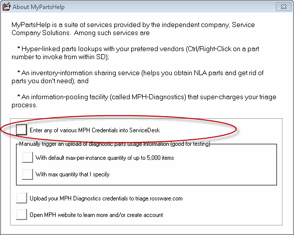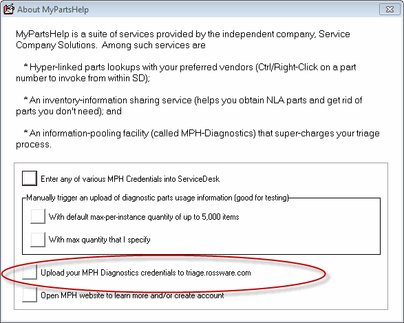 As you might guess, there is a moderate fee for the underlying MPH-Diagnostic service (none from Rossware though; our MPH-Diagnostics connection tools are standard inclusions). In fact, the Service Company Solutions fee is even more moderate if, instead of simply being a data consumer, you are also a data contributor. That is, you allow pertinent data from your operation to be added to that great data store in the sky (i.e., the one that makes such magic happen). To do this, pick the particular ServiceDesk station that you want to have performing the upload task. At that station, you'll put in a second set of credentials from Service Company Solutions. To do this, begin in the same path as was involved for setting consumption credentials (described above) -- but, of course, when getting to the appropriate selection, choose to set Upload as opposed to Consumption credentials.