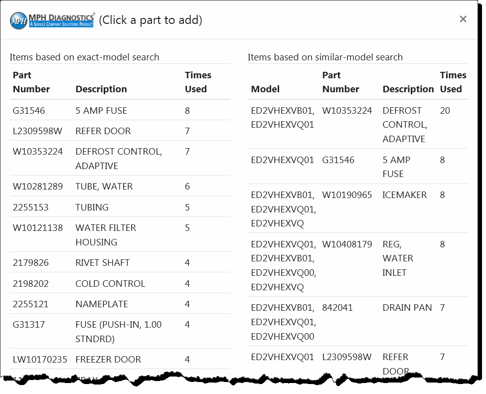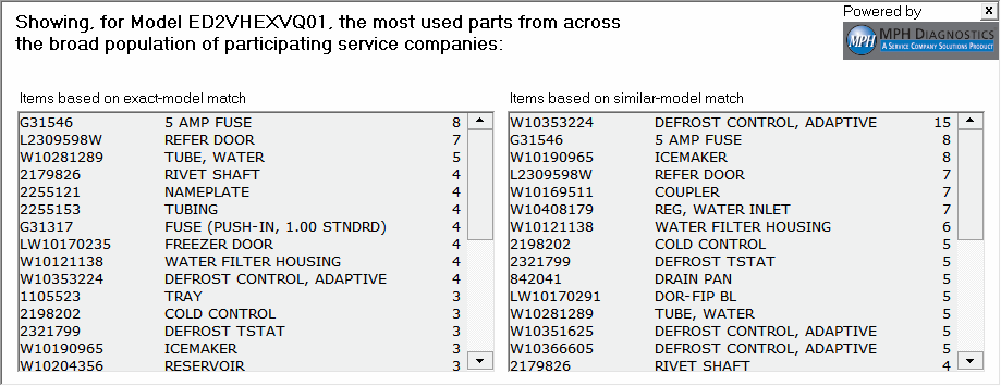 As you can see, there are two sections. One shows parts used on the exact model number that is attached to your JobRecord. The other shows parts used on similar model numbers (if your float your mouse pointer over any right-side item, you'll see exactly which similar model numbers were involved on that part). In each section's right-hand column you see how many times the indicated part was used.