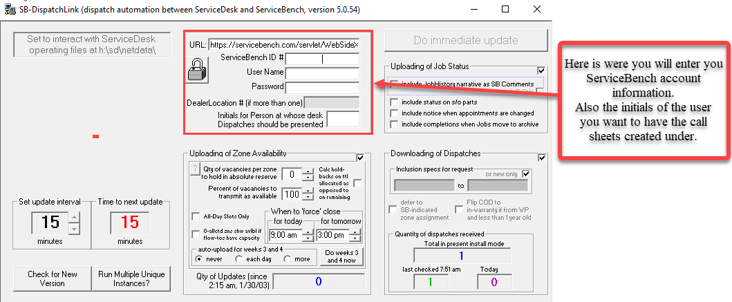 The interval settings are in the bottom left corner of SB-DispatchLink. This is how often SB-DispatchLink talks to the ServiceBench server. If you have a lot of dispatches that need updates, you might want to make the update intervals longer. This gives updates time to finish before SB-DispatchLink tries to update again. The red number shows how much time is left until the next update.