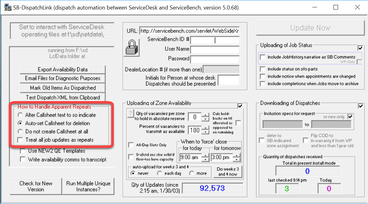 This will treat all job updates, such as rescheduling appointments, updating customer phone numbers, etc., as apparent repeat dispatches and create the CallSheet with the configuration selected from the three radio button options above.