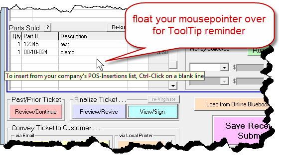 To make use within SD-Mobile, simply, in the "PartsSold" box on the "Print" page, do a Crtl-Click on any blank line. You'll then see a list of the POS-Insertions that your company has setup. Click on any listing for instant insertion