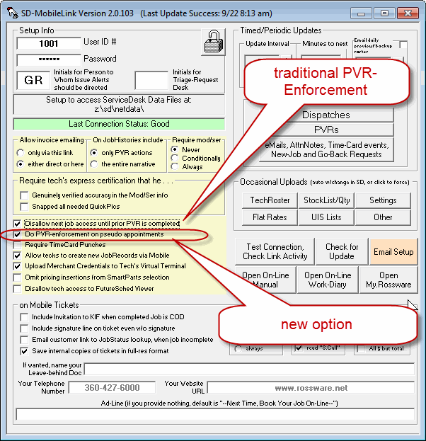 If you do not know, PVR-Enforcement is a feature that helps company management deal with those scofflaw techs that refuse to do their PVRs in real time -- in particular, the ones who are forever determined to just rush onward to each next job, without closing-out needed informational work first, for the job they are presently on. Usually, these guys intend to to all that informational work at the end of the day. Sometimes, they never even get around to it. PVR-Enforcement is a feature you can turn that, basically, won't permit a tech to see such details are needed to drive to the next job until he completes the PVR on his present job.