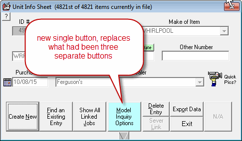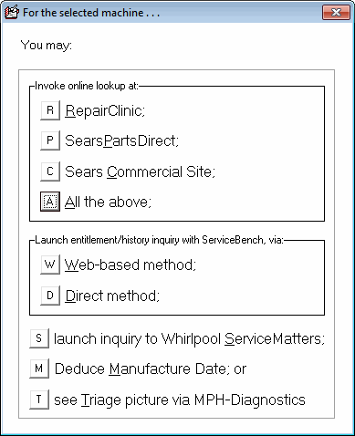 As a further change, we replaced three buttons in the UnitInfoSheet interface (aka UIS, Shift-F12). Formerly, there were two buttons there, each for different warranty-entitlement inquiries with ServiceBench, and one further button for initiating a Whirlpool ServiceMatters inquiry. Now there is a single button in place of those three: