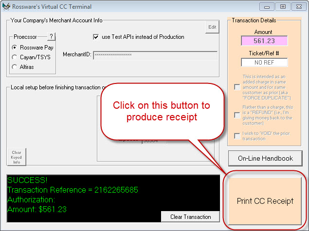 When you use Rossware's own and fully-integrated payment gateway, RosswarePay, you have the option, after running a CC transaction, of creating a CC receipt: