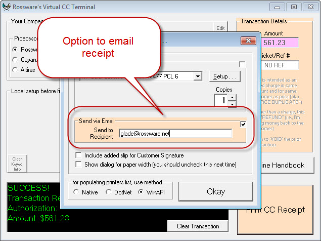 When we first made this option, it only occurred to us to give you the option of printing the receipt. A smart client asked for the option to email it. That's now been added: