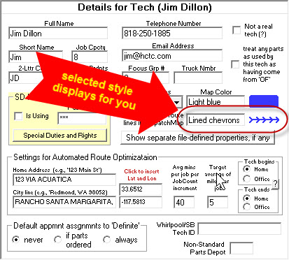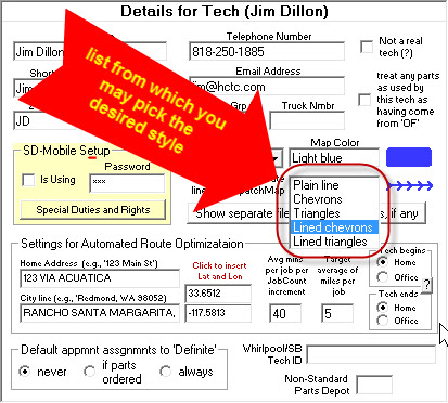 Naturally, the place to pick a desired line-vector style for each/any tech is in the Technician Properties window for that tech, as accessed from within the (Ctrl-F1) Settings form. Just click on any tech's name within the roster of technicians, and the Technician Properties window will appear for that tech. It has a new place for this selection: