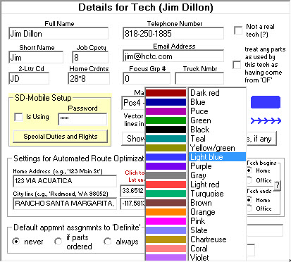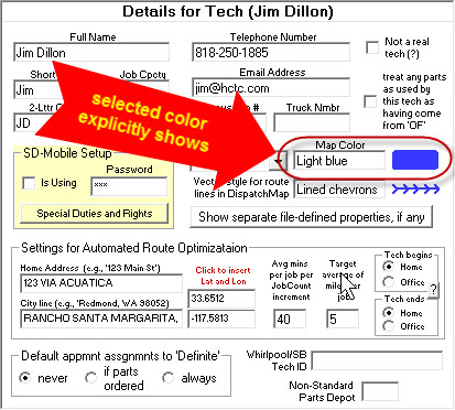 Historically (and in regard to picking each tech's DispatchMap color), the Technician Properties window only offered you a verbal description of each color. In other words, you did not see the actual color (and had to go into the DispatchMap afterwards, to see the actual color you'd selected). Now (as you can likewise see in illustrations above), the selected color is displayed to the right as a colored "blob":