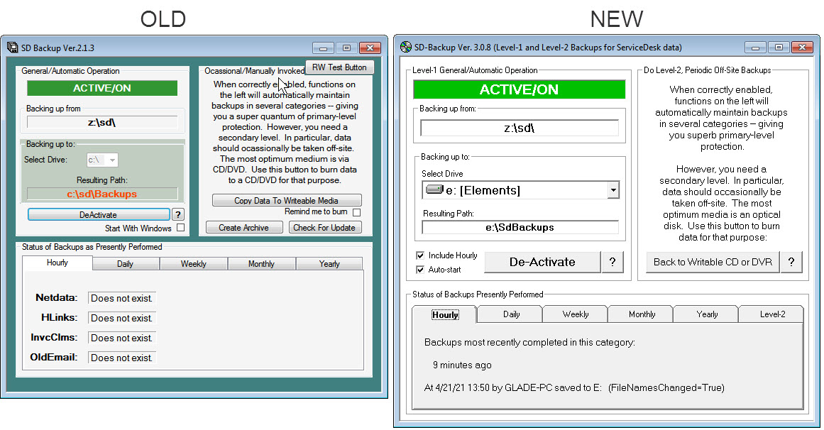 ServiceDesk will now monitor not just for performance of Level-1 backups (and warn if there is an excessive period without detecting those have been performed), it will now similarly monitor (and warn) in regard to Level-2 backups (though its basis for judging an "excessive period" is more liberal on this Level than in the case of Level-1).