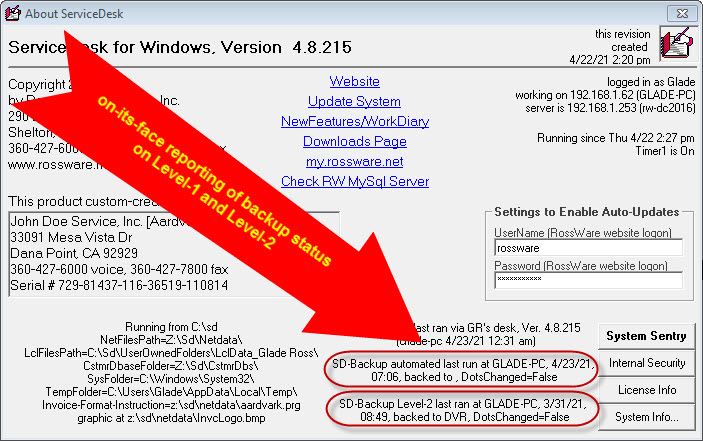 The on-its-face showing of backup status, in the ServiceDesk About form, now reports on both Level-1 and Level-2: