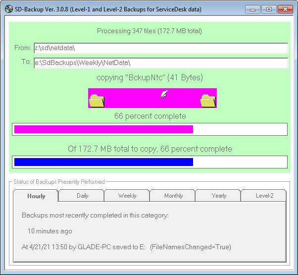 The Level-2 backup system is now much more comprehensive in including all important ServiceDesk data in all of the various sub-folders. Simultaneously, it is much more discriminating in that it avoids copying of files in folders that involve data that is easily replaced and/or would not be missed.