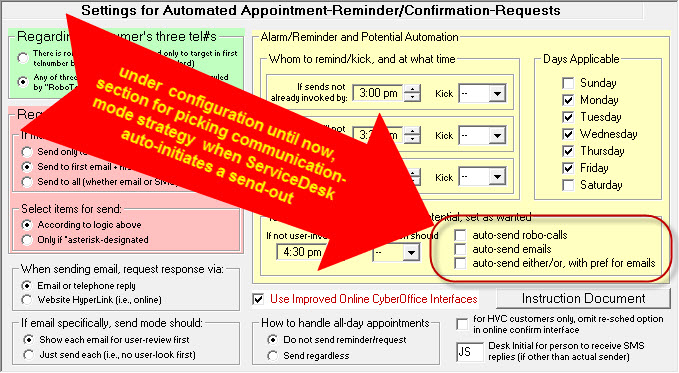 In regard to this latter, we created in the setup interface a place to specify which communications-mode-strategy ServiceDesk should use, in event it did in fact self-initiate the send-out process. That place in the interface looked like this: