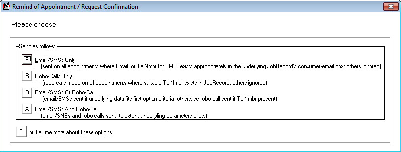 When we first created the appointment-reminder/confirmation-request system, we structured it so, when initiating the send-out process, you could choose whether you wanted to send the communications via: (a) RoboCall; (b) email (in particular, for JobRecords that have an email address); or (c) either of the two, but with preference for email if an email address is present in the JobRecord.