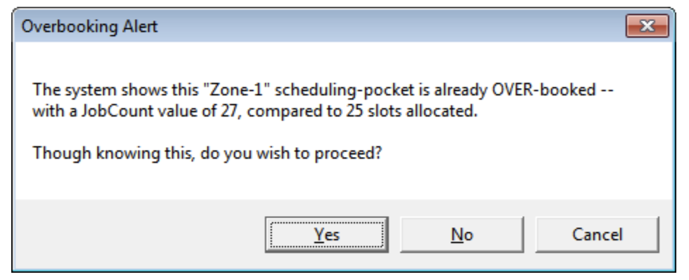 An important part of our Zone-Management system is, if a user is about to book a job in a scheduling pocket (zone, date and day segment) that is already fully booked, a little dialog displays to warn against doing so . . . similar to this: