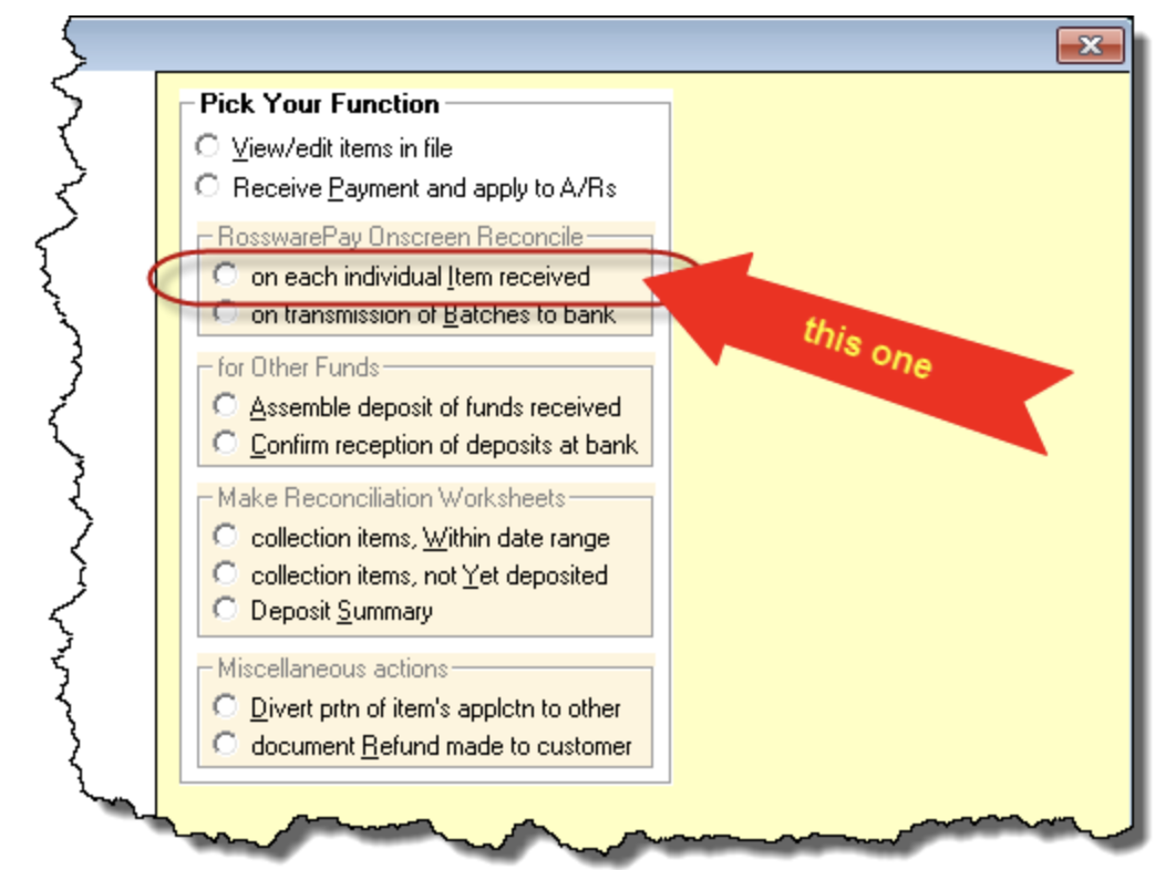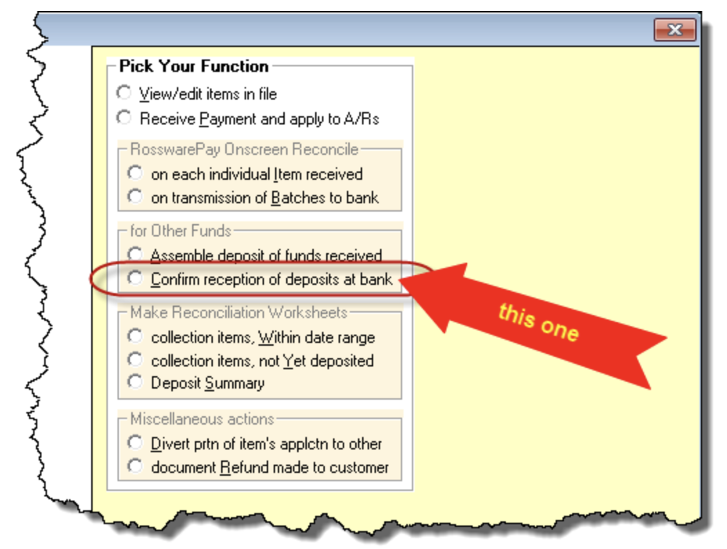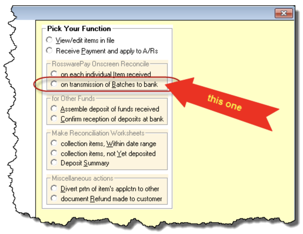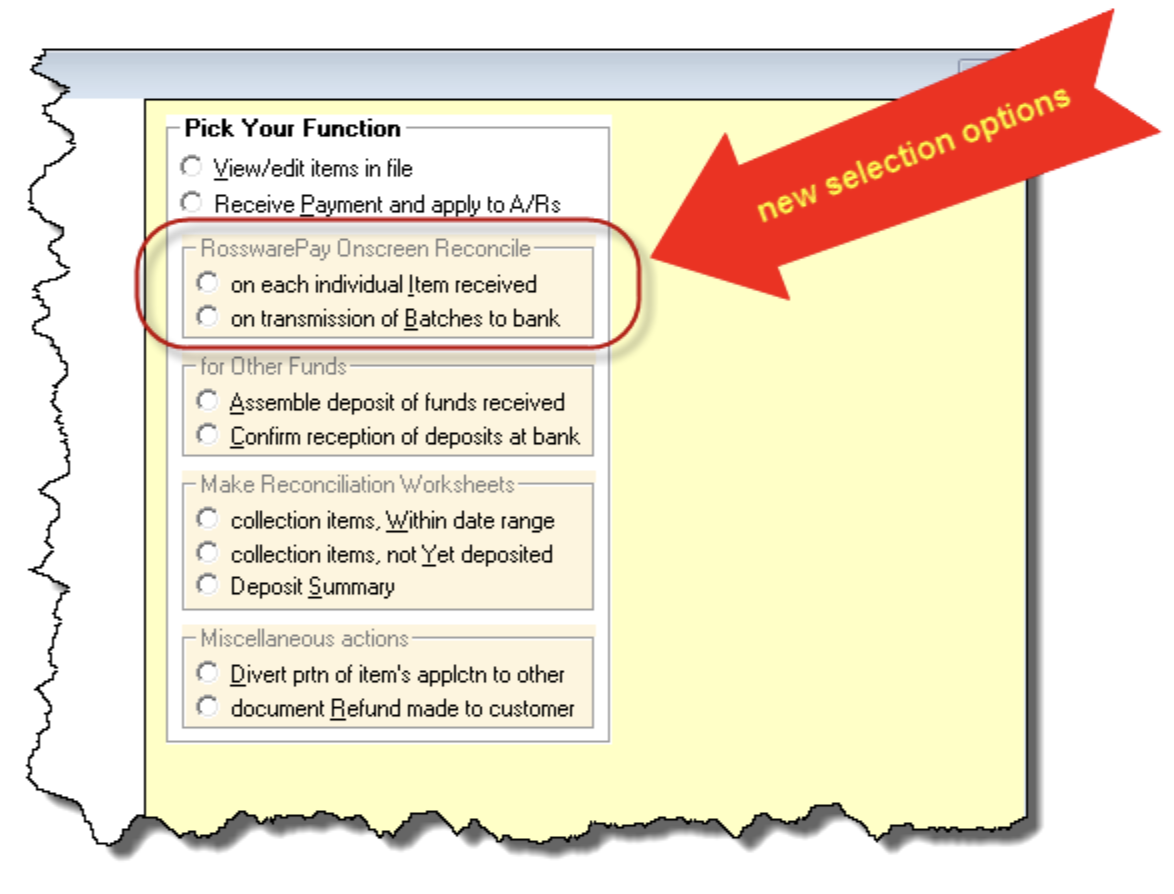 similarly goes into the online data to find actual financial data there. This one finds batch deposits, made from the RosswarePay system into your bank account. It inserts records into the FundsJournal reflecting each such batch deposit. There they await your monthly process of confirming the deposits when you get each monthly bank statement (likely do this as part of the same routine when you reconcile between QuickBooks or similar and your bank statement). That’s when you use this long-existing option, to check-off that supposedly-deposited items indeed and truly reached your bank. :