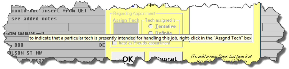 At any rate, there was a request for ability to associate a tech with a job prior to making any appointment. We created facility for this by adding an option in the Create-Job/Sale form. If you go there from a Callsheet that has no appointment indicated, and then float your mouse-pointer over the box where you’d indicate the assigned tech if there was an appointment, you’ll see this ToolTip: