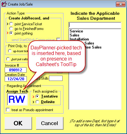 When you then do a Create-Job/Sale transition from that Callsheet, ServiceDesk will note contents in that ToolTip, and will auto-populate the assigned technician box in the little yellow form: