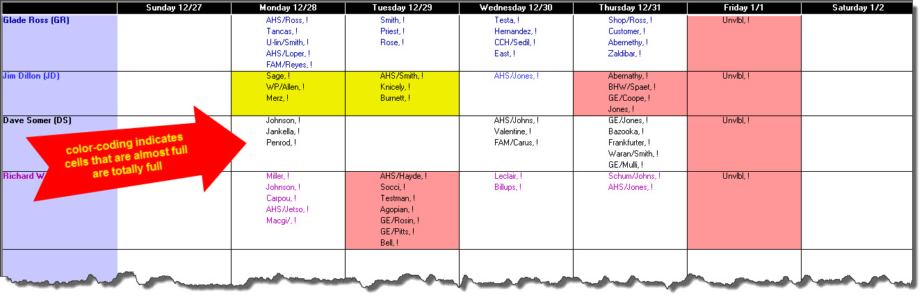 What this improvement does, essentially, is to inform, via color-coding, as to whether each potential scheduling cell still has capacity for added appointments (where a cell consists of the intersection of a particular tech and particular date).
