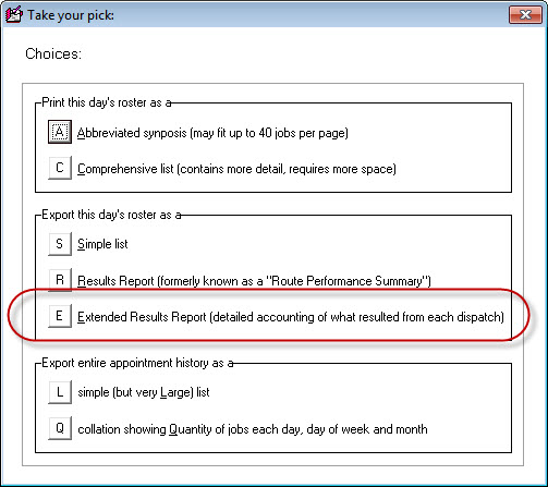 In this case the client wanted, in an export, a plethora of details regarding what had happened on each of the appointments as present in a prior day's schedule. We already had a simple export that otherwise met that criteria (obtained by looking at any past day in the DispatchMap, then picking Alt-P, then choosing "R"). Though we could have extended that already export, we felt it made more sense to leave it as is for those that want just the prior-existing offering, and create a new export for the requesting client (and, of course, for any other user that would like to make use of it). So, the new export option is shown here: