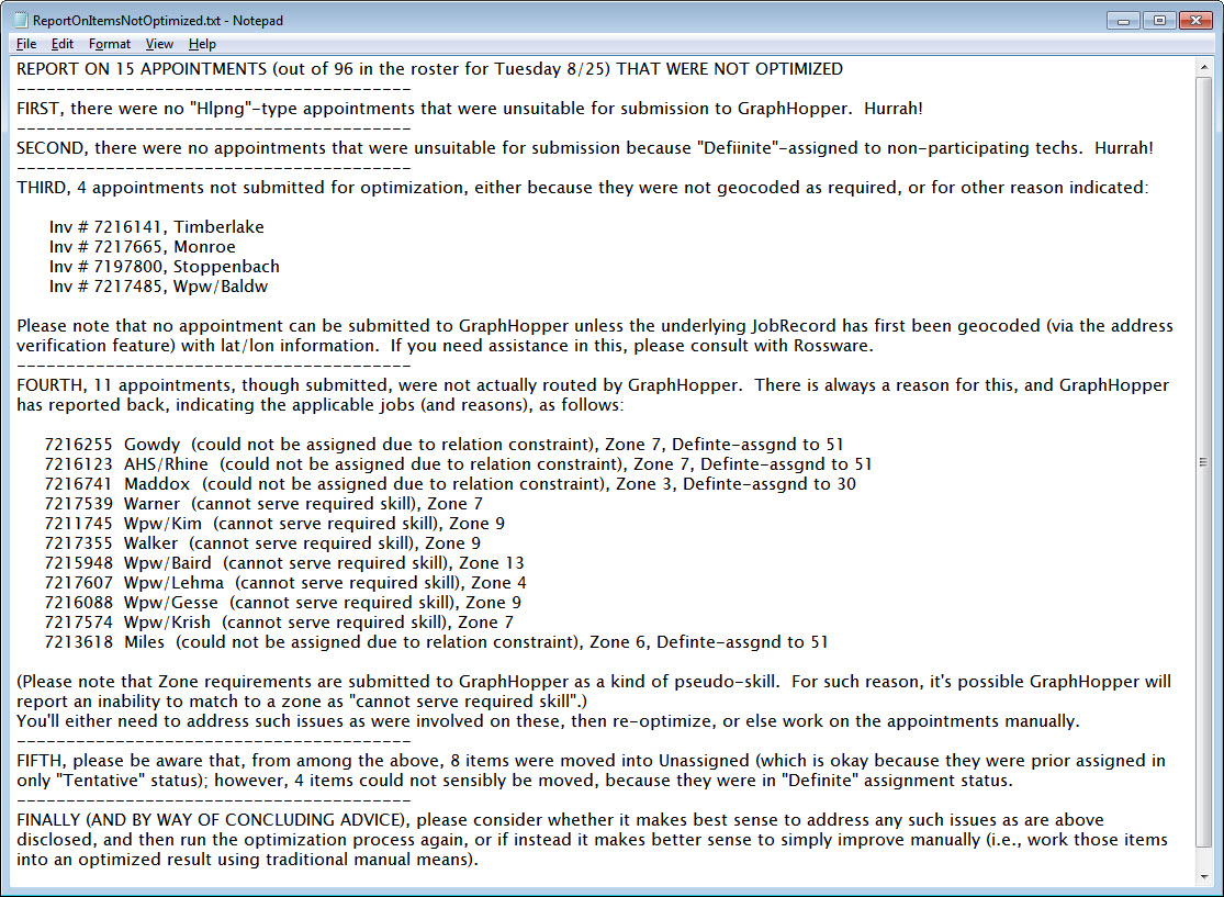In several instances, we've spent considerable time with clients, examining particular results. Time and again, we've found that in each instance where a result seemed un-optimum there was an explanation. Perhaps an appointment was "Definite"-assigned to a tech who was not set as qualified to work in the applicable zone, for example. Perhaps one or more jobs were not even submitted for optimization, because they lacked geocoding. The potential reasons are numerous, and have not on-their-face been obvious absent considerable investigation.