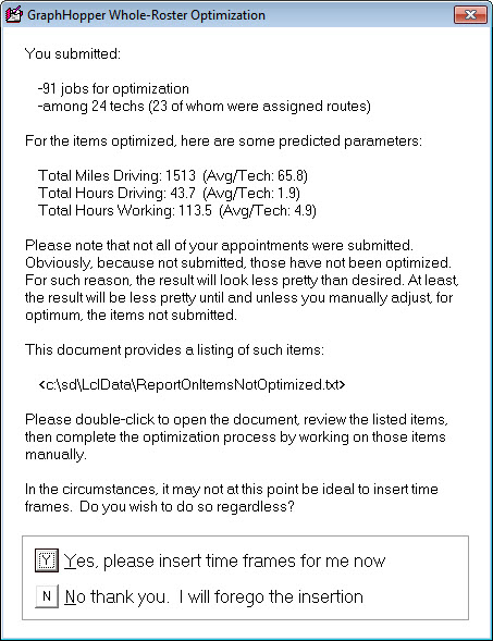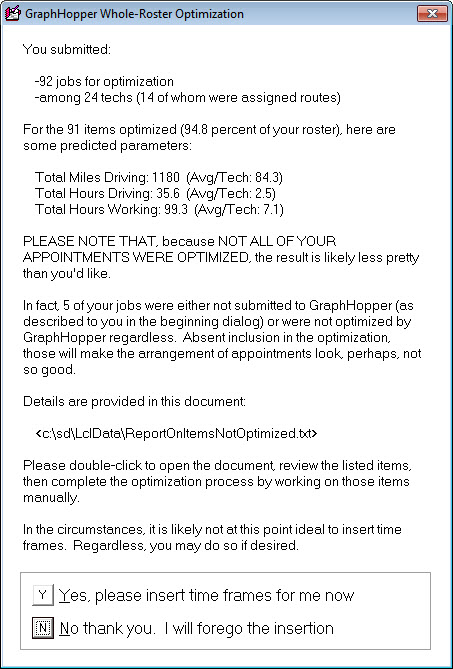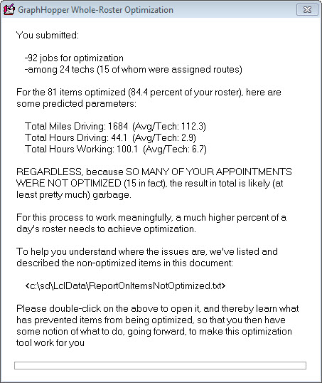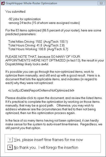 But in contrast to the past, where there's reason to expect less than optimum results, the dialog will much better put you on alert to that fact. Escalating from where problem-reasons are relatively moderate (specifically, if allowing at least 98 percent of the jobs in your roster to be optimized), you'll see something like this:
