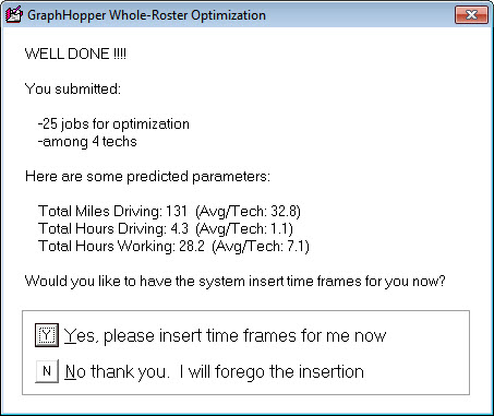 Now, when an optimization request completes, you'll not get the same message regardless of circumstance. Rather, if you were setup in such manner that your entire roster could be properly optimized (and therefore you should positively expect a very pleasing result), the dialog will look something like this:
