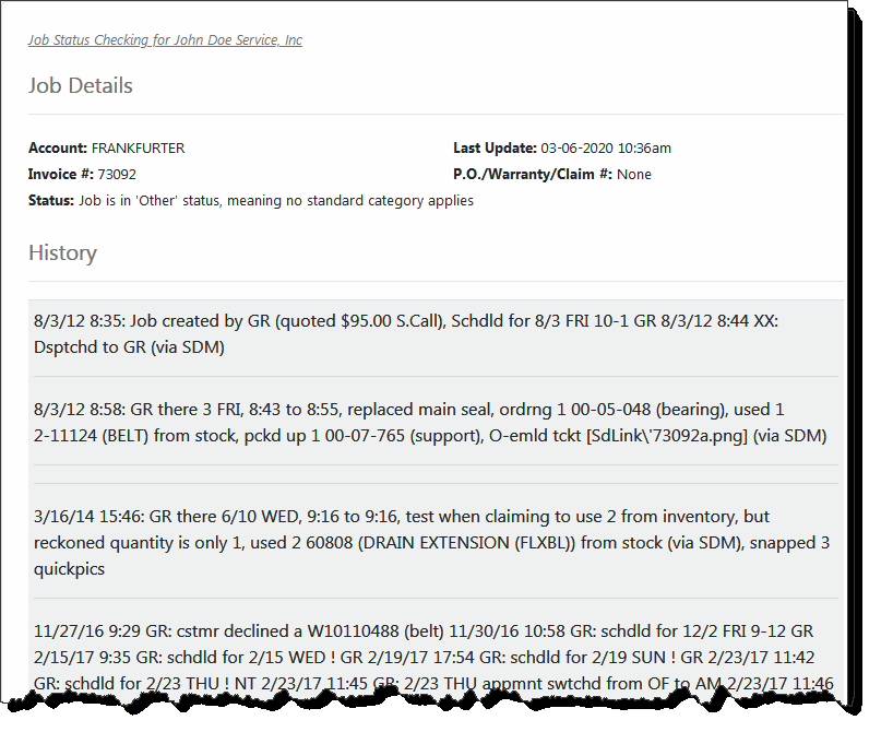 Where your technician submits a PVR yet has not completed the job, you may have been using the option where SD-MobileLink emails the customer a message indicating regret for the non-completion, and offering a link on which she can click to check on the status of the job as you're expediting it forward. Formerly, this communication would go only via email. Now, if you've updated to SD-MobileLink Ver. 2.0.115 or above, it will, when appropriate, go via SMS-text instead (in particular, if the underlying JobRecord specifies a telephone number as a texting candidate or if the tech conveyed an intermediate e-ticket via text).