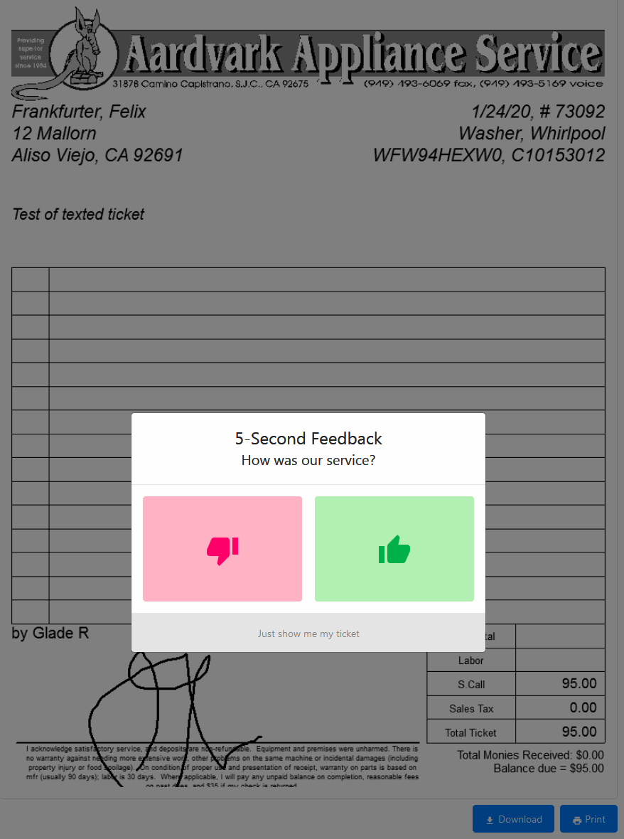 Where the tech has specified that a completed-job e-ticket should be sent via SMS-text, and where you're still using Gen-1 of Reputation Management (remember that Gen-2 combines a satisfaction query with online presentation of the ticket), the survey invite will likewise be via SMS-text.