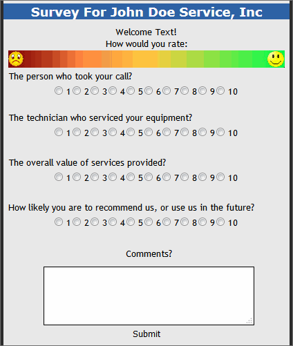 By way of beginning explanation, a hinge point in our "reputation management" scheme is a post-completion satisfaction query. Formerly, the invite to that query could be conveyed via one path only: email. What's more, it would be an email that followed separately and after one that had just been sent conveying your customer's e-ticket as an attachment. Regardless, if your customer clicked with assent to do the query, she'd see a non-Mobile-friendly interface with appearance like this:
