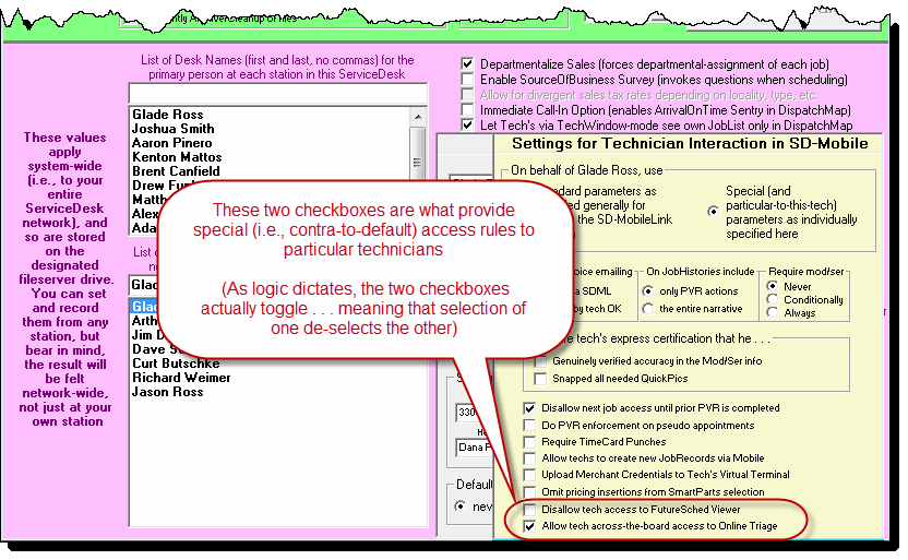By standard default, your technicians are permitted access to the Future-Sched Viewer (let's them see their upcoming appointments, and appointments in the past going back two weeks), but not to Online-Triage. You can change the first default, and make exceptions from default for any tech where you wish to do so. If you want your techs to generally be disallowed from access to the Future-Sched Viewer (i.e., change the default on that question), there's a checkbox in SD-MobileLink where you can make that the setting. To change the access of any individual technician, just click on his name within the Tech Roster of ServiceDesk's Settings form (Ctrl-F1), then, in the Technician Properties window, click on the "Special Duties and Rights" button. Select the radio button that indicates you want to set special rights for this technician, then set according to your preference: