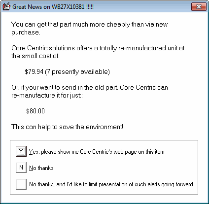What it does, specifically, is self-invoke a behind-the-scenes (invisible to the user) inquiry on the applicable partnumber whenever you click into a (F8) PartsProcess record. This inquiry is made to CoreCentric's server, and essentially "asks" if the partnumber is one on which CoreCentric can provide a replacement or rebuild. If the answer comes back as a "yes," ServiceDesk presents a message similar to this (if the answer is not yes, the user will be totally unaware that any inquiry occurred):