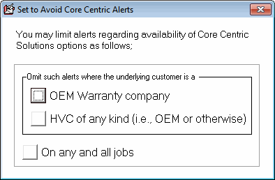Please note there is a third option whereby you may choose to limit such presentations going forward. We provide this because: (a) if you simply don't want these alerts, you should have a right to avoid them; and (b) it's possible particular classes of your customers disallow use of re manufactured parts, and, if so, it would make good sense for you to not be bothered by these alerts when involved with jobs working for such customers. Thus, if you choose that third option you'll see choices as follows: