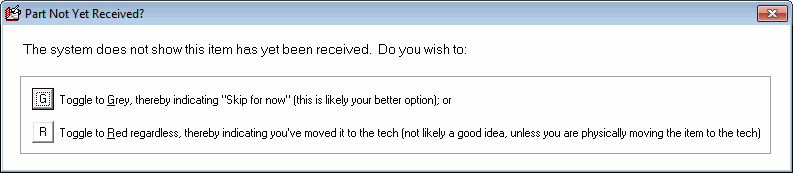 The sad thing is, it turns out we'd not thought to put in any similarly-direct notice for where a part has been ordered for a job on the applicable roster, but has not yet been checked in as having been received. All we'd done for this situation, so far, is made it so, if a user claims he or she is moving such a part to the tech, a message comes up like this: