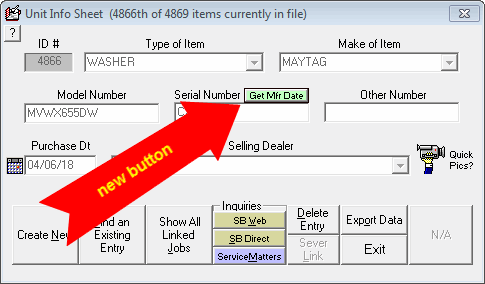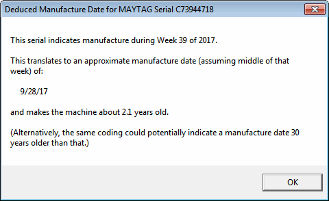At this time, we've created coding by which ServiceDesk can deduce date-of-manufacture info on the basis of serial numbers from Samsung, LG, Bosch and the Whirlpool, Maytag-pre-Whirlpool, General Electric and Electrolux families of brands. Going forward, we can potentially add more on the basis of your requests.