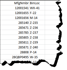 As a BTW, a good way to initiate the building of any such file is to have ServiceDesk first create a spreadsheet that contains (among things) all of the PartNumbers in your MasterPartsPlan, then you can delete all the columns except the partnumber column, and then add in text to the second column, for each line-item where you want to specify a bin location. To have ServiceDesk create this spreadsheet for you, go to your MasterPartsPlan (Ctrl-F10), click on the "Print Options" button, then pick option "A".