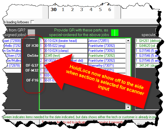 It's long been a feature in this interface that you could float your mouse-pointer over a center- or third-column line item (the boxes that indicate items to go out with a tech) and a note will show in red text just above to indicate the HoldLoc and any notes attached to the PartsProcess item. The problem is, you had to float your mouse-pointer to see this. Now, if you click in the toggle box to set either of these two sections for scanning mode (and whether you otherwise use the scanning mode or not), a HoldLoc showing will appear just to the left of each applicable line-item.