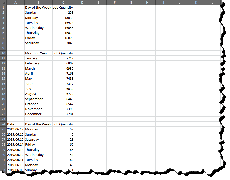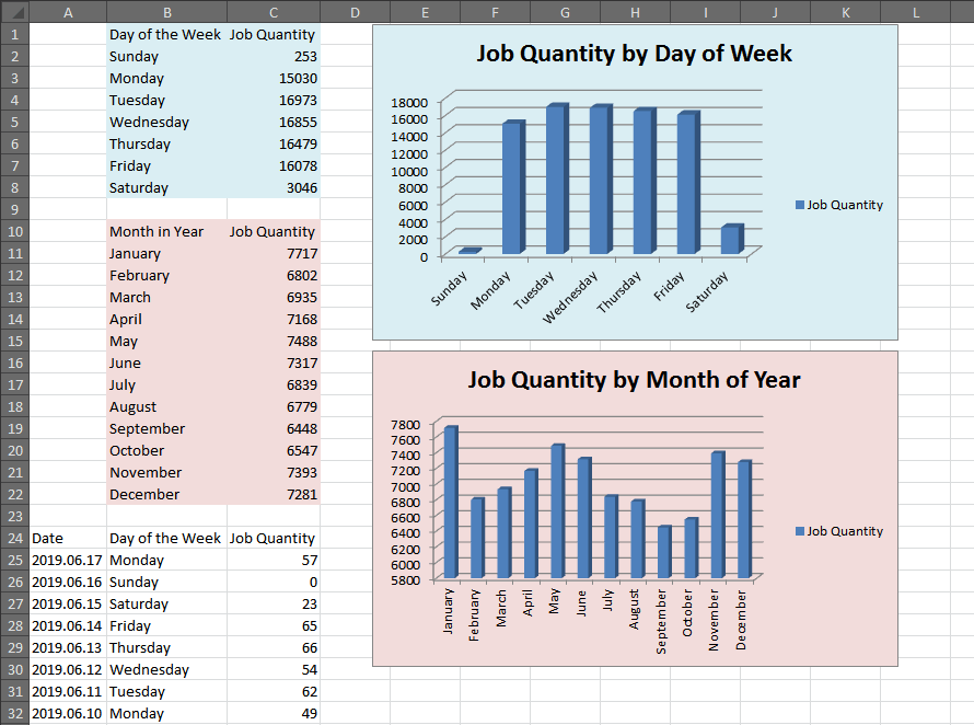 Based on the first two sections, you can easily make cool graphs that will allow you to see instantly on which days of the week and in which months of the year you have historically been most busy, versus least busy: