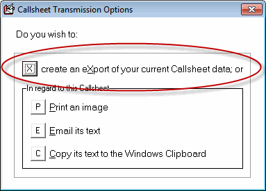 This was needed by Janice Salmon at Just Press One for automating some of their processes. To invoke the export, simply hit Ctrl-P (for "Print" Options) from within any Callsheet. In response, you'll see this: