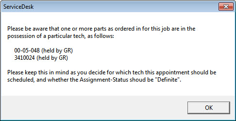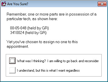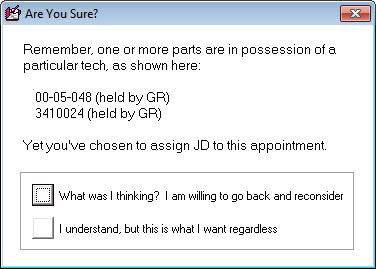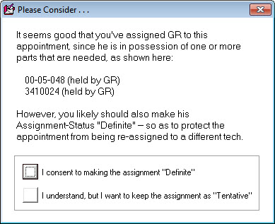Or, if the CSR has chosen to assign the appointment to the tech who has in his possession such parts as are needed, but has neglected to set the assignment status as “Definite,” the system presents this: