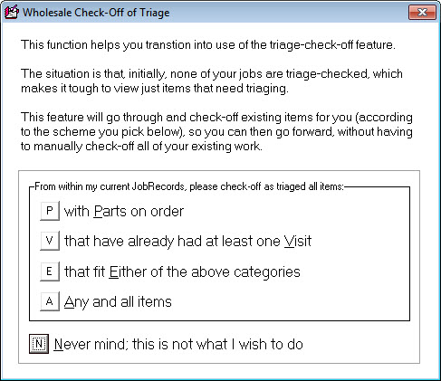 Regardless, we've learned that some users, though wanting to embrace this power, have been held back by a silly little obstacle. It is that, for the triaging effort to be easy, you want to presented only with jobs that have not yet been triaged. Yet, if you're only beginning to use the system, all your jobs will show as not yet having been triaged, and that may be overwhelming.